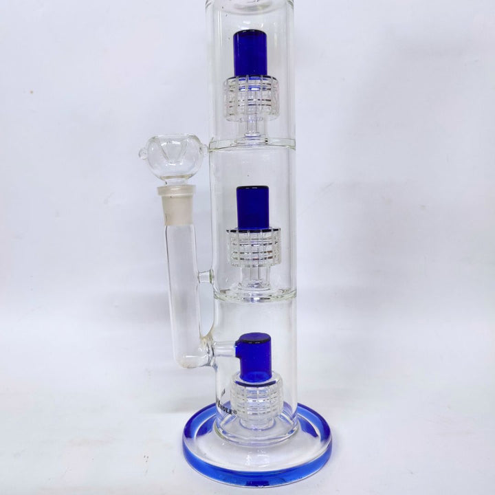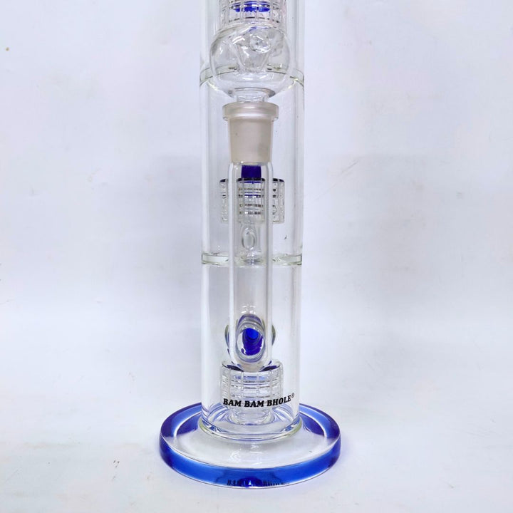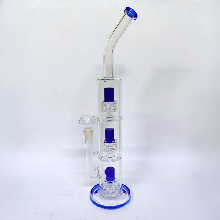The Galactic Triple Percolator Glass Bong stands 18 inches tall and features a three-chamber percolation system that cools and purifies smoke for exceptionally smooth, weightless hits. Crafted from durable borosilicate glass, it offers a sturdy wide base, a sleek vertical body, and an ergonomic curved neck for comfortable use. Its black-topped matrix diffusers evoke the engines of a galactic cruiser, elevating your smoking experience to interstellar heights with both style and performance.