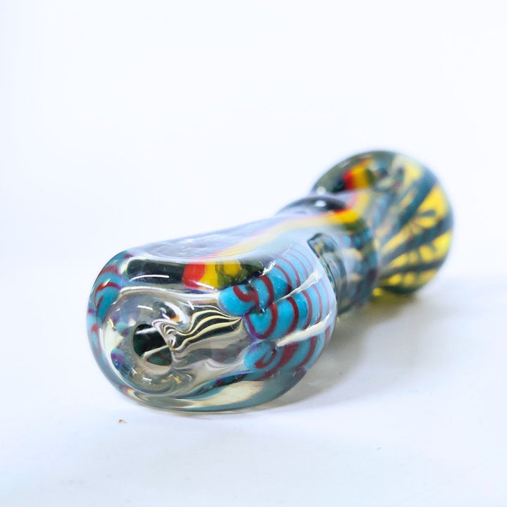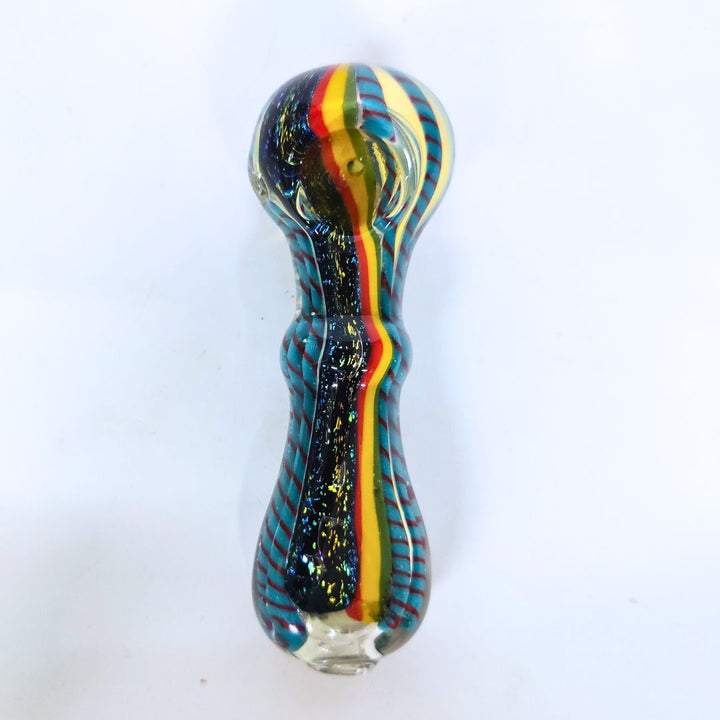 The Rasta Spark Handmade Glass Pipe brings vibrant energy and smooth performance together in one striking piece. Hand-blown from premium heat-resistant glass, this 5-inch (13 cm) pipe is designed to stand out with its bold Rasta-inspired colors — red, yellow, and green — running through the center, surrounded by shimmering black glass and blue patterned sides.